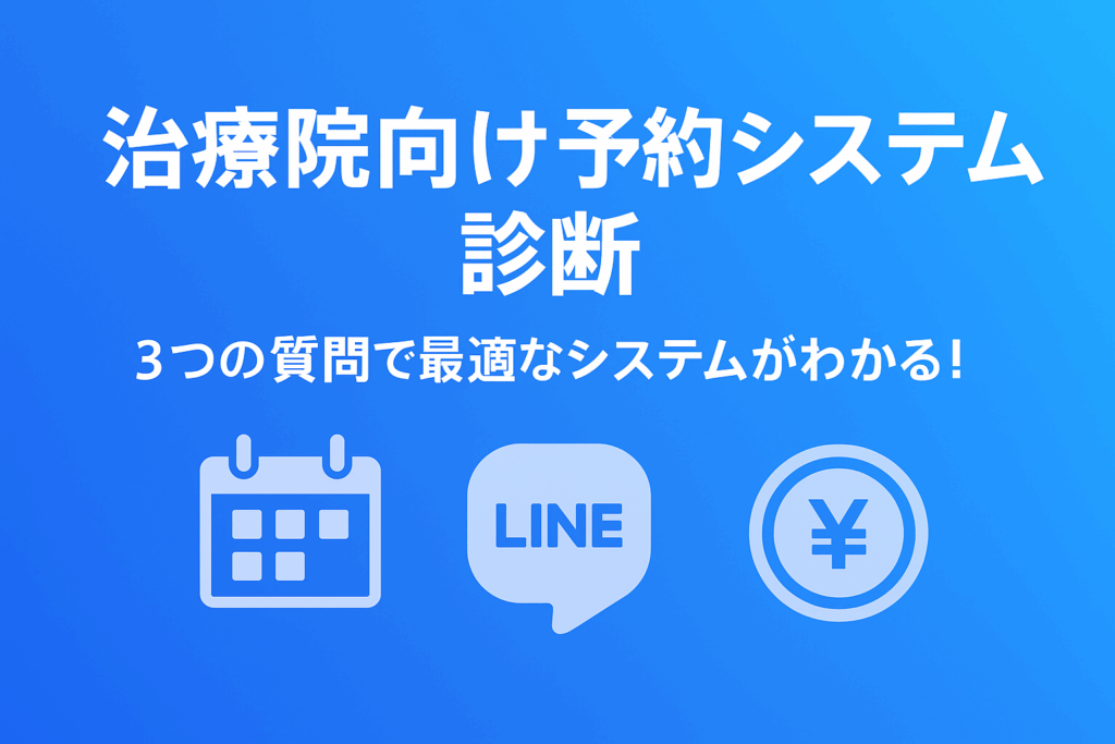 治療院向け予約システム診断 2025.08.272025.08.28 「予約システムは多すぎて、どれを選べば良いのかわからない…」 そんな治療院経営者の方のために、30種類以上の予約システムを徹底比較しました。 簡単な3つの質問に答えるだけで、あなたの院にぴったりなシステムがわかります。 → 価格重視?LINE連携?多店舗管理? 迷ったときは、ぜひこの診断を活用してください! あなたに最適な予約システム診断 以下の3つの質問に答えてください。 Q1. 院の規模は? 個人院(1店舗) 複数店舗(2店舗以上) Q2. 重視するポイントは? 価格の安さ LINE連携 UI・使いやすさ 多店舗管理 Q3. 月額の予算は? ~5,000円 5,000〜10,000円 10,000円以上 診断する